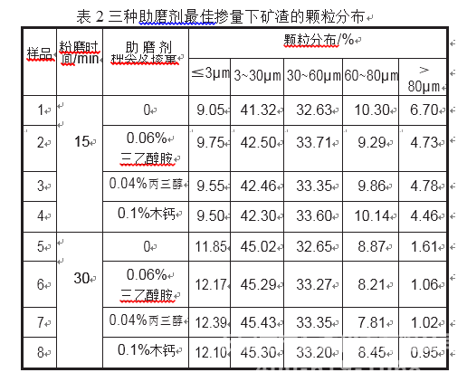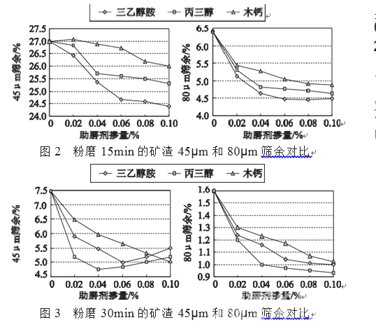 1)三种助磨剂都有良好的助磨效果,在相同的粉磨时间内都能提高矿渣细度。 综合考虑各种因素,