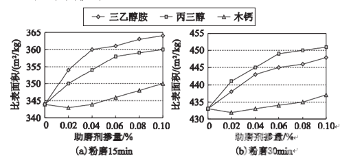 三乙醇胺的效果最好,而在粉磨 30min 时,丙三醇的效果最好。木钙在掺量比较少时,比表面积几乎没有增加,这是因为木钙是工业废料,所含的助磨成分较少。 从比表面积结果看,对掺加