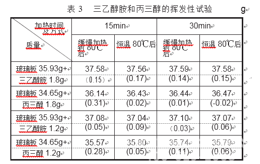 三乙醇胺和丙三醇在缓慢升温到 80℃和恒温 80℃,干燥时间分别为 15min 和 30min 的挥发性试验。