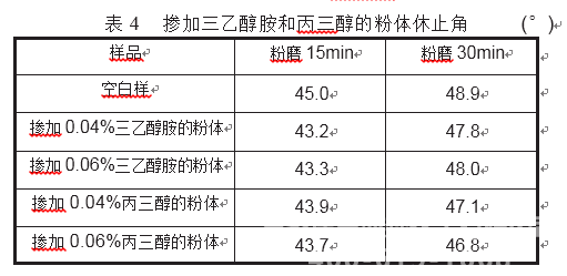 三乙醇胺和丙三醇都能降低粉体的休止角,增加粉体流动性,解决粉体团聚现象。粉磨 15min 时,掺