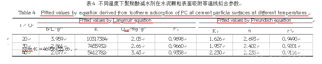聚羧酸减水剂在水泥颗粒表面上吸附等温线的影响,采用Langmuir方程和 Freundlich 方程对该吸附等温线进行拟合, 并计算出吸附过程的吸附热力学常数