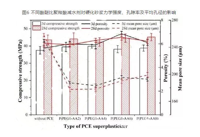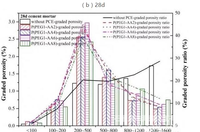 通过水溶液自由基聚合法合成了一系列不同酸醚比的聚羧酸减水剂(PCE)。研究了不同酸醚比的聚羧酸减水剂对新拌水泥浆体含气量及流变性的影响,以及对硬化水泥砂浆孔隙率、孔结构及力学强度的影响。研究结果表明:随着酸醚比的增加,聚羧酸减水剂分散性能及引气性能显著增加,其中当丙烯酸与TPEG单体摩尔比例达到4:1时,聚羧酸减水剂分散性能及引气性能均达到较大值,随着酸醚比的进一步增加,聚羧酸减水剂分散性能与引气性能呈下降趋势。随着酸醚比的增加,聚羧酸减水剂在水泥颗粒表面的吸附能力增加,使得水泥颗粒表面的聚羧酸分子浓度增加,降低“水泥颗粒-水”之间固-液界面能。聚羧酸减水剂能够显著改善硬化砂浆孔径分布,在引入大量中小气泡的同时降低大孔径气泡的占比,使得气泡孔径分布更加细小化。同时,随着聚羧酸减水剂主链中酸醚比的增加,引入的小孔占比呈下降趋势,大孔占比呈上升趋势。