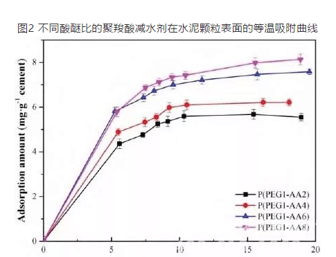 聚羧酸减水剂分子的减水剂机理之一在于聚羧酸分子上的极性基团(如羧基等)由于本身带有负电荷,与水泥颗粒表面的Ca2+结合后起到“锚”的作用,使得聚羧酸分子吸附在水泥颗粒表面。因而极性基团的电荷密度将影响着聚羧酸分子的吸附特性,负电荷密度越高,其吸附能力越强。Felekoğlu B等研究表明一般情况下,羧基密度越高,聚羧酸减水剂的吸附率也越高,并且初始和易性也更好。Winne feld等则指出当侧链密度较高,主链电荷密度下降时聚羧酸减水剂的吸附性能也将变差。Vickers通过研究提出主链电荷密度高的聚羧酸减水剂消耗的会更快,水相中保存的聚羧酸分子数量也消耗的更快。因此由于不同的极性官能团类型以及官能团密度将导致聚羧酸减水剂主链上的电荷密度不同,最终影响聚羧酸减水剂在水泥颗粒表面的吸附能力,使得水泥颗粒表面以及液相中的聚羧酸分子浓度存在差异。
