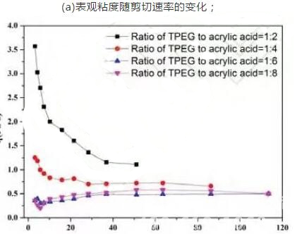 固定水灰比为0.29,分别将TPEG与丙烯酸摩尔比为1:2,1:4,1:6和1:8的聚羧酸减水剂按照0.15%(固含量)掺入水泥浆体,测定水泥浆体流变性。水泥浆体的表观黏度及剪切应力随剪切速率的变化曲线分别见图3。当TPEG与丙烯酸摩尔比为1:2时,聚羧酸减水剂表观黏度最大。这说明随着聚羧酸分子中羧基密度逐渐增大,浆体表观黏度逐渐减小,以TPEG与丙烯酸摩尔比为1:6时,水泥浆体的表观黏度最小,屈服应力最小。当TPEG与丙烯酸以摩尔比为1:6合成聚羧酸减水剂时,所合成的聚羧酸减水剂具有较好的分散性能,使得水泥浆体凝聚结构数量以及强度降低,浆体表现出较好的流变性能。