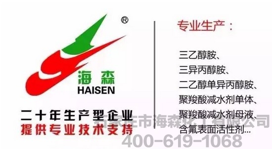 石家庄市海森化工有限公司主要生产:三乙醇胺系列;聚羧酸减水剂单体系列、聚羧酸减水剂母液系列;三异丙醇胺系列;二乙醇单异丙醇胺系列;含氟表面活性剂系列;聚乙二醇(PEG)系列、吐温系列、平平加系列;脂肪醇聚氧乙烯醚等各种非离子表面活性剂;水泥助磨剂母液、建筑添加剂等。