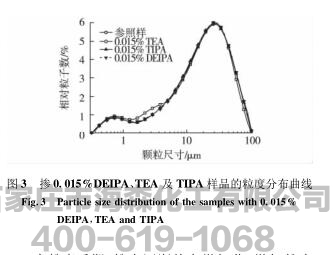 图3掺0.015%DEIPA、TEA及TIPA样品的粒度分布曲线Fig.3Particlesizedistributionofthesampleswith0.015%DEIPA,TEAandTIPA