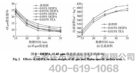 1)DEIPA有效促进了水泥粉磨过程,掺0.015%的DEIPA的水泥粉磨25min即可获得和参照样粉磨35min相近的45μm筛余量。掺入DEIPA的水泥粉磨试样的Blaine比表面积均较参照样降低,这和DEIPA改变了水泥粉体在Blaine法测定介质中的透气性有关。