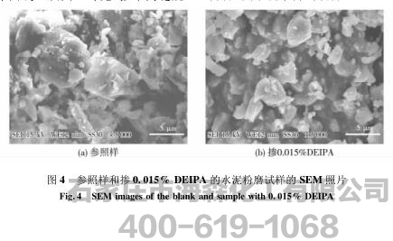 图4参照样和掺0.015%DEIPA的水泥粉磨试样的SEM照片Fig.4SEMimagesoftheblankandsamplewith0.015%DEIPA