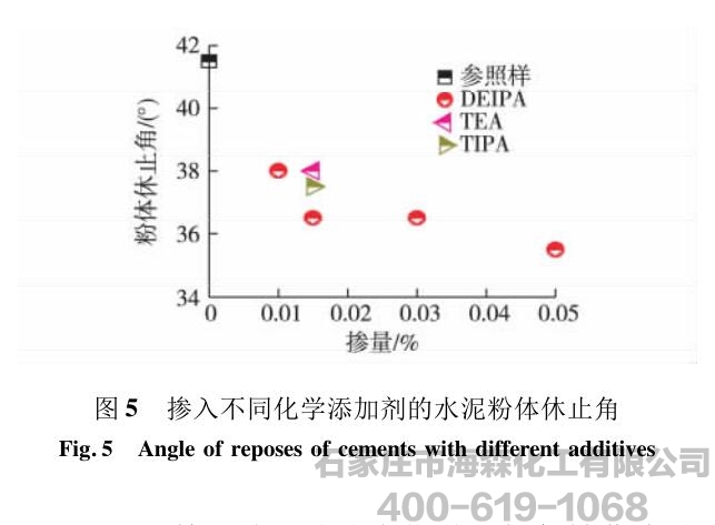 图5是掺入不同种类及掺量的DEIPA、TEA及TIPA的水泥粉磨试样的休止角。从图5看出:参照样休止角为41.5°,掺0.015%的DEIPA、TEA及TIPA的休止角分别为36.5°、38°和37.5°,说明链烷醇胺的加入均降低了水泥粉体的休止角。此外,在DEIPA掺量从0.01%增加到0.05%时,水泥粉体休止角随DEIPA掺量增加有逐渐降低趋势。