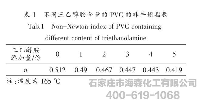 三乙醇胺含量的PVC在165℃时的非牛顿指数n如表1所示。