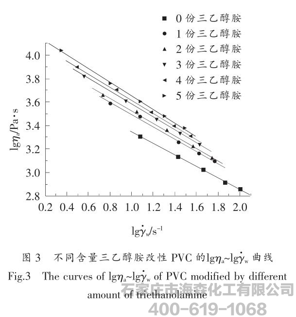 三乙醇胺改性PVC的lgτw~lgγw曲线,表明改性PVC的剪切应力与剪切速率的关联。从图2可见,经拟合后曲线呈现良好的线性关系。在实验温度下,随着剪切速率的增加,改性PVC的剪切应力也随之增加,为假塑性流体。在相同剪切速率下,其剪切应力随