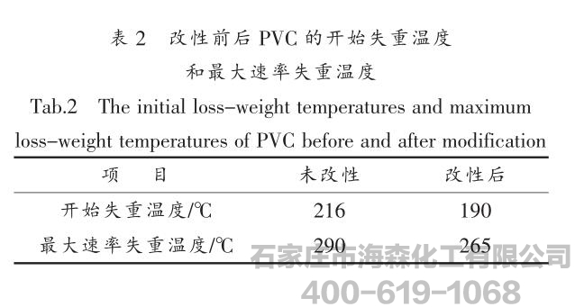 (3)改性前后PVC的热重曲线在改性后PVC的初始失重温度以下观察不到区别,对初始失重温度以上的热重曲线分析表明:
