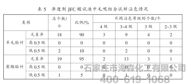 渗透剂JFC的添加大大提高了试液的润湿性能,尤其是对毛呢、羊毛衫等较难润湿试样,0.03%