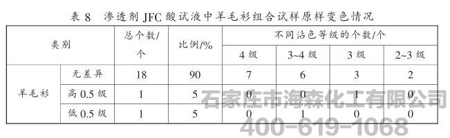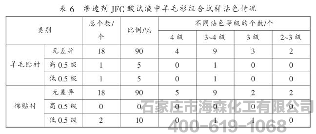 渗透剂JFC对试验溶液润湿性能的影响,并以毛呢以及羊毛衫的组合试样的耐酸水色牢度为研究对象,对试验结果的准确性和可比性进行了探讨。