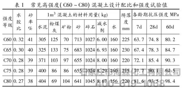 计算混凝土的配合比时,情况不可能是完全理想的,要结合实际情况,充考虑生产和施工上的要求,如拌合物的和易性要求、环境、温度、施工方法、运输设备等。高强混凝土的配置强度应是强度等级值的1.12倍以上。高强混凝土配合比的试配和确认的步骤按普通混凝土方法进行。得到了基准配合比后,另外两个配合比的水胶比分别增加和减少0.02。配合比确认后,应用该配合比进行不少于三盘的重复试验进行验证,且每盘的混凝土抗压强度均应高于配置强度。配制C60~C80时,水胶比宜控制在0.27~0.34范围内,胶凝材料用量宜控制在480~580kg/m3。砂率尽量控制在0.35~0.42范围内,当混凝土强度等级较低时可以适当放大砂率。对于在高强混凝土的配制时对坍落度大小的要求,可以根据混凝土的运输和浇筑时所需的时间来决定,具体的情况可通过高效减水剂的掺量进行调整。高效减水剂的掺量一般为胶结料的0.8%~1.8%。表1给出了常见高强度等级混凝土的配合比。