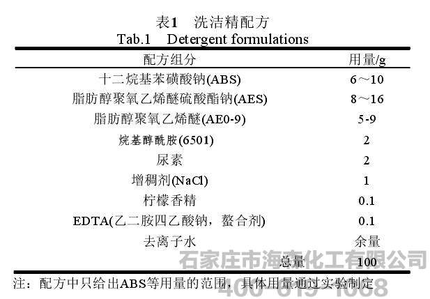 (1)根据餐具洗洁精中主要活性成分表面活性剂的活性机理,与各种助剂复配出高性能,低成本的洗洁精配方组成。