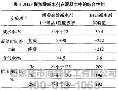表4为性能最优的JH23聚梭酸减水剂按GB8076一1997《混凝土外加剂》标准进行的主要性能检测结果。从该表可知,JH23聚梭酸减水剂性能不仅符合缓凝高效减水剂一等品的要求,而且主要性能指标大大优于标准要求。