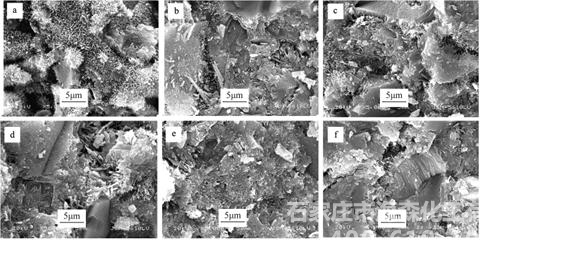 从图 4e 可以看出,水化产物较为纤细,不能充分填充空隙,C-S-H 之间以及 C-S-H 与矿物颗粒之间的连接不够紧密。而图 4f 和图 4g 中的晶体分布均匀,表面光滑平整,内部孔隙明显减少,这些水化产物之间相互交叉结合,形成了更为致密的板状结构。