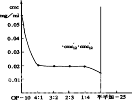 平平加 -25的加入量为 1 时 , 即能显著降低表面活性剂O P —10 的临界胶囊浓度, 发生正协同效应 。但当