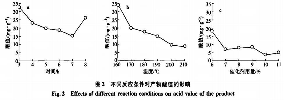 3.1.4、反应温度对产物酸值的影响适宜的反应温度对反应体系中的转糖基反应和酯化反应非常重要。在,I(PEG 400):n(淀粉)-n(松香)4.5:1.5:l,催化剂用量8%,反应时间7 h,常压下产物酸值与反应温度的关系见图2(b)。由图可知,200℃时酸值较低,且发现在210℃时有焦化现象,综合考虑,选取反应的适宜温度为200℃。