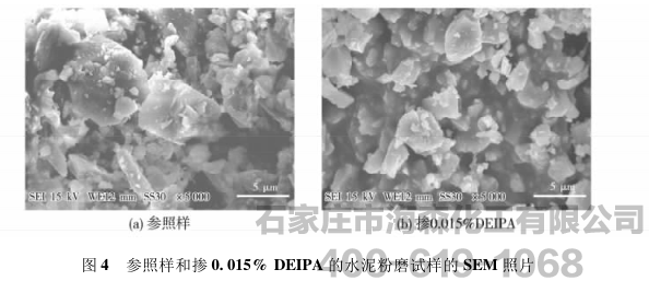 2)DEIPA在粉磨过程中的助磨特性与TEA及TIPA相似。掺入0.015%的DEIPA、TEA及TIPA均降低了小于5μm区间的微细颗粒含量,改变了水泥粉体的粒度分布,从而消除了研磨体表面的“垫层”及过粉磨现象。