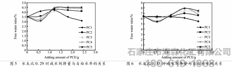 图5、6的基本走势类似,只是随着水灰比的提高其自由水率增加。因为掺水量提高,游离水会增多,自由水率就会提高。水灰比为0.29时,空白组的自由水率为3.5%,水灰比为0.35时,空白组的自由水率为6.6%。PC1与PC2~5之间的自由水率走势不同,PC1呈现先增加后减小的走势,而PC2~5呈现先减小后增加的再平稳的走势。在掺加少量减水剂(<0.5g/300g水泥)时,PC1的自由水率增加,而具有FA-TEA的PC2~5的自由水率却降低的,并且随着FA-TEA含量的提高,自由水率减小幅度越大。这是由于在该水灰比下,PC1~5都有一定的解絮凝作用,使自由水量提高,而随着解开絮凝结构的增多,水化面积增多,形成结合水的量增多,但是