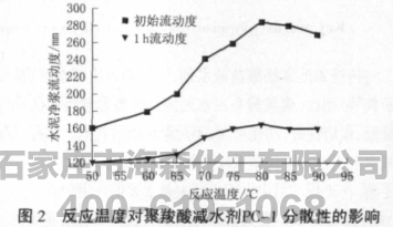 聚羧酸减水剂PC-1的方法,考察反应温度对PC-1分散性能的影响。试验结果如图2所示。