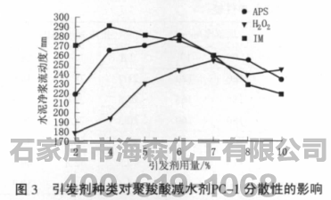 引发剂是产生自由基活性中心的物质,不同引发剂具有不同引发效率。为了选择适合PC-1的最佳引发剂,对比了APS、H2O2和IM等3种引发剂的效果。固定反应物单体配比为n(APEG)∶n(MA)∶n(SMAS)=1.0∶2.4∶0.4,反应温度为80℃条件下,研究引发剂种类对减水剂性能的影响,试验结果如图3所示。