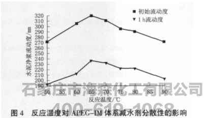 分散性能的影响对于自由基聚合而言,一方面,温度是影响聚合的重要因素之一。这是因为温度过低,引发剂引发效率较低,造成自由基浓度低,反应速率慢,转化率低;而温度过高,反应过快,极易爆聚,造成分散性较差。另一方面,原材料的活性、引发剂的分解特性以及反应体系的聚合速率等也都会影响聚合温度。固定n(APEG)∶n(MA)∶n(SMAS)=1.0∶2.4∶0.4,选取IM复合引发剂最佳掺量4%,研究反应温度对减水剂分散性能的影响,结果如图4所示。