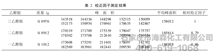 三乙醇胺为标准物,由f′i=miAsmsAi求出三种乙醇胺的相对校正因子,结果见表2。