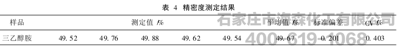 三乙醇胺平均含量为49.67%,CV=0.403%,精密度很好。
