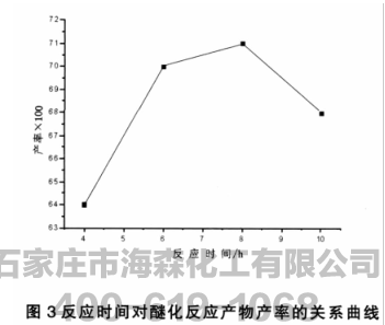 从图3可以看出,反应时间在6h之前醚化反应产物产率提高较快,8h后继续延长反应时间则产率有所下降,这可能是因为随着反应时间的延长,反应物浓度下降,使得反应物之间的碰撞几率变小,产率降低。同时反应时间过长也会因为1,3-二溴丙烷的水解而使产率降低,并且从实际生产成本考虑反应时间控制在6h为宜。