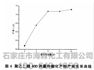 聚乙二醇400具有螺旋结构,可以折叠成不同大小的空穴,能与不同半径的离子配合而进行转移催化反应。从实验结果比较,聚醚的催化效果虽然不如季铵盐,但它具有价廉,无毒,易于生物降解以及在非弱酸条件下热稳定性好的优点。在适当温度下