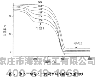 聚乙二醇中乙二醇单体含量的变化,其热失重曲线也发生较大的变化,在温度约200~300?乙二醇单体失重变化(实际为乙二醇的挥发量)形成平台1,400~600?为
