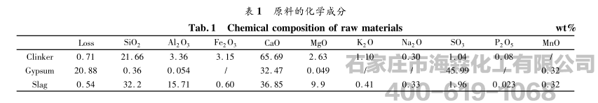 熟料、石膏和矿渣都是采用市场常见的,其化学成分见表1。试验用TEA和TIPA为南京红宝丽生产,TEA纯度大于99%,TIPA纯度大于95%。