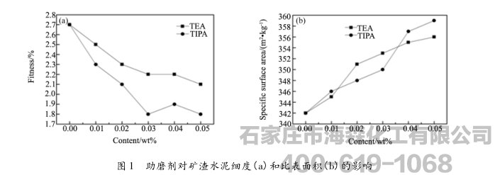 (1)TEA和TIPA均能减小矿渣水泥的细度,增大比表面积,提高细颗粒的含量,增加水泥需水量,但对凝结时间的影响较小;