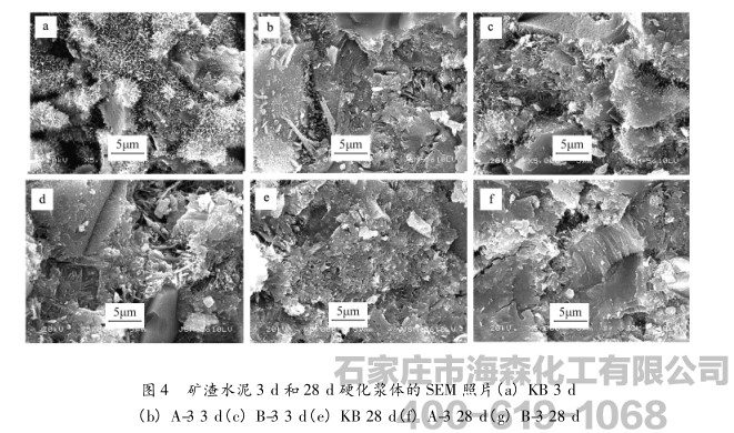 从图4a中可知,在水化3d时,KB样的矿物颗粒已被侵蚀,颗粒表面生成了团簇状和细针状的C-S-H,相互之间还没有紧密连结,颗粒间的空隙率大,形成的空间网状结构比较疏松。仍有未发生水化的晶体,其表面轮廓清晰可见。而图4b和图4c与之相比,矿物的水化反应较为充分,晶体间的孔隙率小,水化产物之间相互紧密搭接,形成比较致密的板状结构。