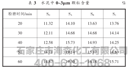 比较表2中的数据可以看出,粉磨30min后,掺入助磨剂的水泥试样45μm筛余已基本不变,但比表面积随粉磨时间增加而持续增加。这是因为比表面积是0~3μm的颗粒起决定作用,如表3所示,30min时SA中0~3μm颗粒含量为14.68%,60min时增至19.30%,因此导致水泥比表面积的增加。45μm筛余则用于区分>45μm和<45μm的颗粒含量,其他具体粒径段(区间)的颗粒含量无法得到,且粉磨一定时间后>45μm的颗粒含量很低甚至几乎全部通过筛,如表2中数据所示,粉磨30min试样SC中45μm筛余为1.15%,40min时降至0.70%,60min时则为0.69%,可见30min后利用45μm筛余继续对助磨剂助磨作用进行表征已无实际意义。