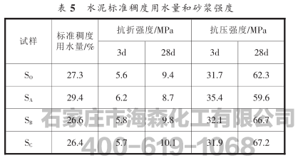 粉磨50min的水泥试样的标准稠度用水量和砂浆强度测试结果见表5。助磨剂的应用影响了水泥标准稠度用水量,其中SB和SC的水泥标准稠度用水量下降,SA水泥标准稠度用水量增加,其原因在于乙二醇使水泥中0~3μm颗粒含量增加到19.14%。相对于不掺加助磨剂的水泥试样,