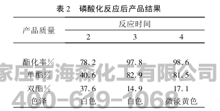 当反应温度为100℃,物料比为3:1并以混合酸作为催化剂,分别进行磷酸化反应2h、3h、4h,所得的产品结果如表2。