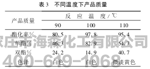 在以混酸为催化剂。物料比为3:1的前提下,反应温度分别为90℃、100℃、110℃进行反应3h,所得的产品结果如表3。