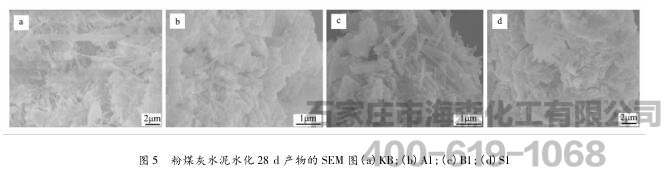 氢氧化钙的含量从侧面反应了反应(4)、(5)进行的程度。因此,我们仍可以用氢氧化钙的含量来说明粉煤灰水泥的水化程度。A1-28,B1-28,S1-28中氢氧化钙的峰值都要比KB-28的弱,说明在后期反应过程中氢氧化钙被大量消耗用来参加后续反应(4)和(5)。生成的反应物使水泥后期强度大幅度提高。其中,A1-28和S1-28中氢氧化钙的峰值最小,说明粉煤灰反应的最完全,这也是A1和S1后期强度高的原因;B1中氢氧化钙的含量次之,但要比KB中的含量少。