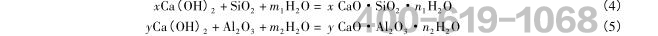 水泥水化28d后测得的XRD如图3所示。从图3中可以发现,硅酸三钙和硅酸二钙的峰强已经很弱了,说明大量的硅酸三钙和硅酸二钙已参加反应生成了硅酸钙凝胶体系和氢氧化钙。而产物中的氢氧化钙与粉煤灰中的活性二氧化硅和氧化铝反应生成了具有水硬性的水化硅酸钙和水化铝酸钙,因此,氢氧化钙也会大量减少,具体反应式如下: