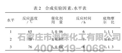 本实验在确定PEG400为催化剂的条件下,以对反应产率有影响的反应温度、催化剂用量(β-萘酚:催化剂)、反应时间、底物摩尔比(β-萘酚:溴乙烷),四个因素为研究对象,因素水平见表2。