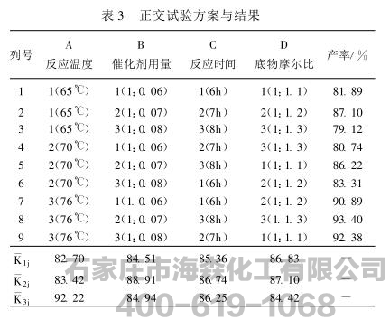 从表3可知,反应温度对产率影响最大,温度升高,产率也随之提高,但由于回流液的影响,温度最高只能到达76℃,故76℃是合成橙花醚的最佳温度。