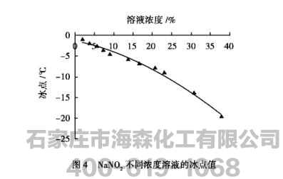 图3与图4分别是NaCl、NaNO2的不同浓度溶液冰点值,与图1、图2中的FH新型防冻剂材料相比,非常明显地看出,在相同浓度下,FH溶液的冰点值较NaCl的溶液冰点值低出1倍以上,而较NaNO2的冰点值低6倍以上,因此,FH新材料在负温混凝土抗冻性能中将会显示出显著的冰点效应。很显然,由于冰点效应极其明显,FH-C、FH-N是具有比NaCl、NaNO2更明显的抗冻作用,或者在同一冰点下,FH-C、FH-N的掺量要远远低于NaCl、NaNO2,从而显著减小Na2O的含量。