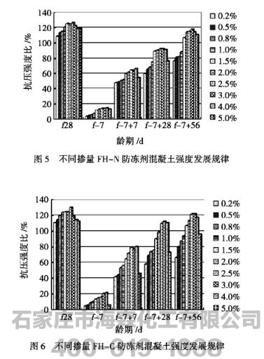 通过研究FH新型防冻剂溶液的冰点效应、-15℃、-10℃、-5℃负温条件下混凝土中的强度发展规律、在不同负温下的适宜掺量,并与JC475-2004《混凝土防冻剂》标准指标值进行比对,从而推出一种超低掺量、无氯、微碱的新型混凝土防冻剂。