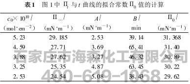 式中,Π∞是t->∞时的表面压;A值是解吸全过程的表面压降;B值决定了Πt指数衰减的快慢程度。当t->0时,Π0=Π∞+A,故Π∞和A决定了Π0值的大小。通过式(2)对实验数据进行数值拟合,相关参量见表1。