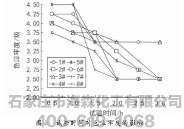平平加O-25与染料分子的结合更加充分,达到一定时间后,表面活性剂与染料分子的结合和释放达到平衡,同时染料分子的扩散和对织物的吸附也达到平衡。因此,试验时间确定为2h。