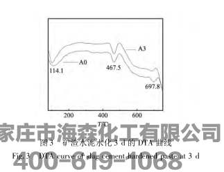 由图3可以看出,二者的图谱谱形相似,DTA曲线吸热峰都一样,都在114.1℃、467.5℃、697.8℃有吸热峰,这些峰分别对应C-S-H和水化硫铝酸钙(AFt)脱水、Ca(OH)2脱水、碳酸钙分解的吸热峰。同时,在114.1℃处的峰,A3的峰要比A0深而窄,说明A3的水化硫铝酸钙和AFt要相对多些,这也从侧面说明了水化3d时,掺有